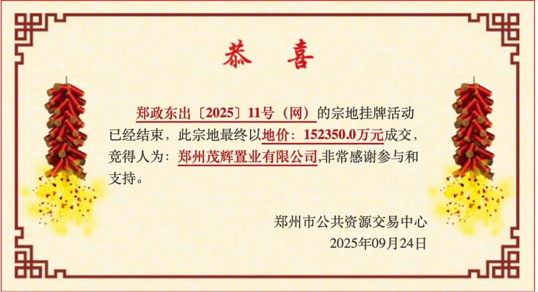 9月24日,郑州市北龙湖成功出让1宗涉宅地块,由郑州茂辉置业有限公司以底价152350万元摘得。天眼查信息显示,该公司为中国金茂旗下公司。